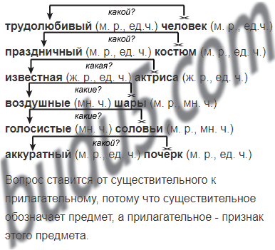Укажи род и число имён существительных и имён прилагательных. Покажи графически, от какого слова к какому ставится вопрос. Как ты думаешь, почему вопрос ставится от существительного к прилагательному, а не наоборот?