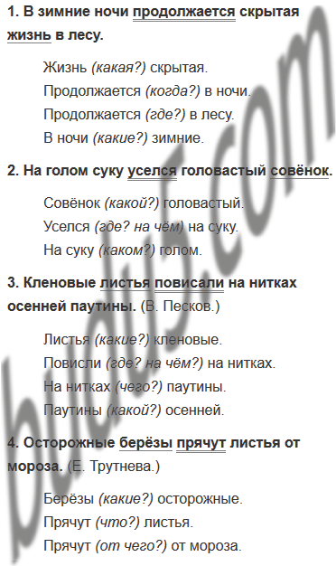 1. В зимние ночи продолжается скрытая жизнь в лесу. 2. На голом суку уселся головастый совёнок. 3. Кленовые листья повисали на нитках осенней паутины. (В. Песков.) 4. Осторожные берёзы прячут листья от мороза. (Е. Трутнева.)