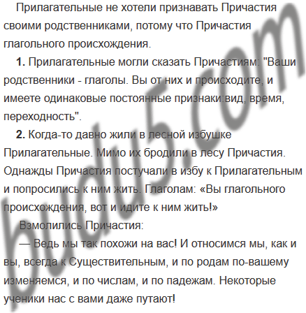 Давно это было. Стояла в лесу избушка. И жили в ней Прилагательные. А по соседству с ними бродили в лесу Причастия. И не было у них ни хлеба, ни крова. Вот собрались как-то Причастия и решили проситься на постоянное жительство к Прилагательным. Пошли они к избушке, где Прилагательные жили, постучали и попросили пустить их к себе жить. Только не согласились Прилагательные принять гостей, отправили их к Глаголам: «Вы глагольного происхождения, вот и идите к ним жить!»