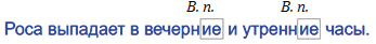 Роса выпадает в вечерние и утренние часы. (Повествоват., невосклиц., простое, двусост., осложнено однородными второстеп. членами).
