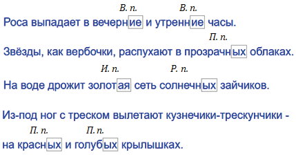 1. Звёзды, как вербочки, распухают в прозрачных обл..ках. 2. На воде др..жит зол..тая сеть солнечных зайчик..в. 3. Из-под ног с треск..м выл..тают кузнечики-тр..скунчики - на красн..х и голубых крылышк..х.
