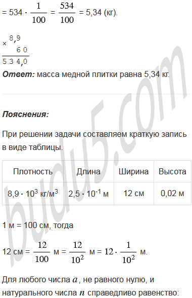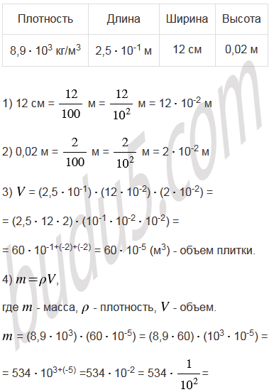 Плотность меди равна 8,9103 кг/м3. Найдите массу медной плитки, длина которой 2,510-1 м, ширина - 12 см, а высота - 0,02 м.