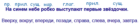 Вверху, вокруг, впереди, позади, справа, слева, вчера, завтра, сначала, потом.
